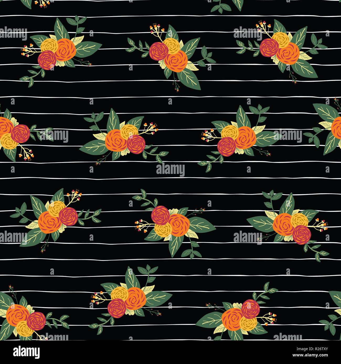 Daisies flowers on stripes background flowers in vector. Booth background black and white stripes red rose. Seamless pattern flowers floral pattern on black background with stripes.